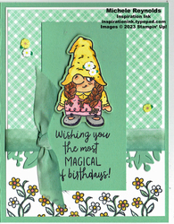 Mount the birthday sentiment from the Friendly Gnomes Set on Block C. Ink it up with the Tuxedo Black Memento Ink Pad. Stamp it in the center of the bottom of the vertical 2-1/8" x 4-1/4" Mint Macaron rectangle so it is close to the bottom edge.