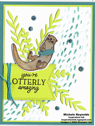 Use Stampin' Dimensionals to adhere the colored otter image cut out to the front of the card as shown so he overlaps the top of the sentiment banner a bit.